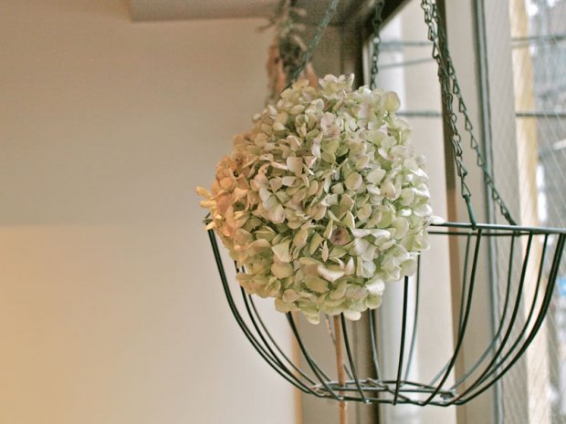 大きな松ぼっくりとドライフラワーで秋仕様にしています。