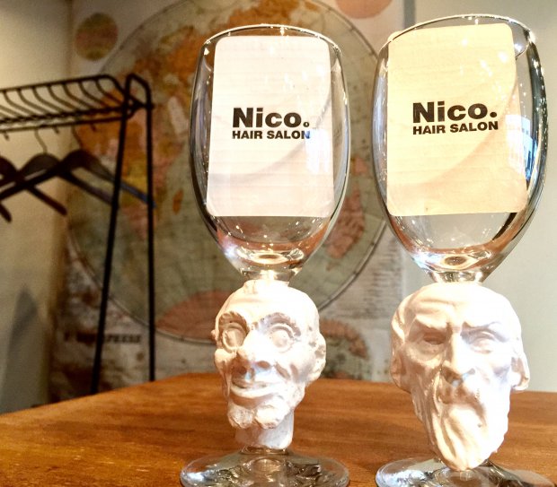 シャンプー台にあるインテリアがたくさんある棚にあるグラス達。